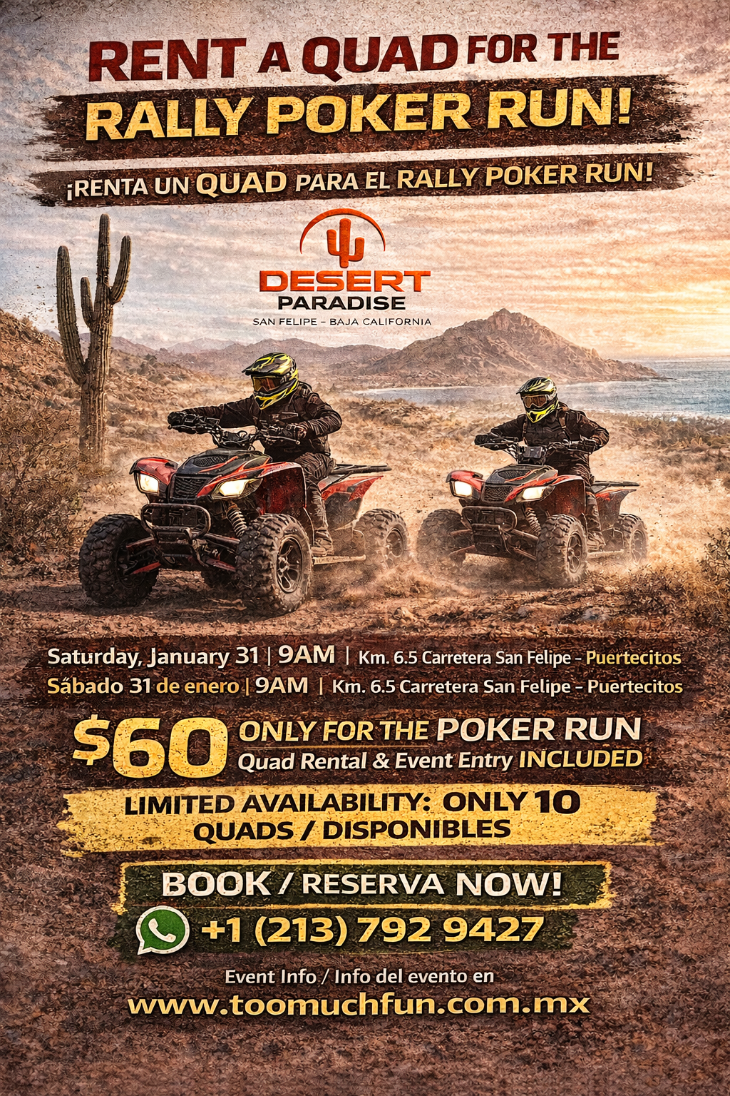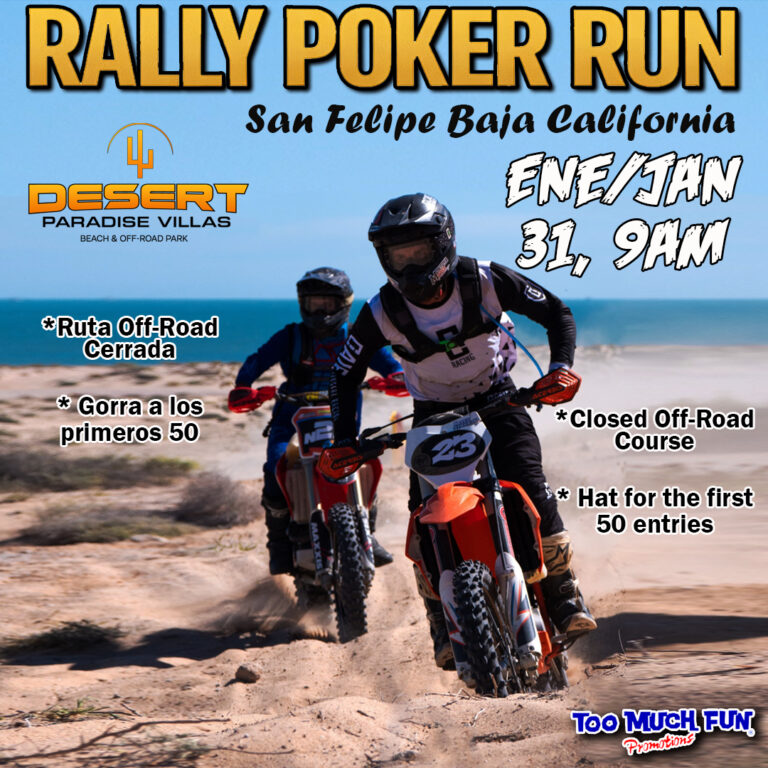 Grandes premios: Una mensualidad GRATIS en la compra de un lote en el Desarrollo Desert Paradise, a los 3 primeros lugares del Rally Poker Run